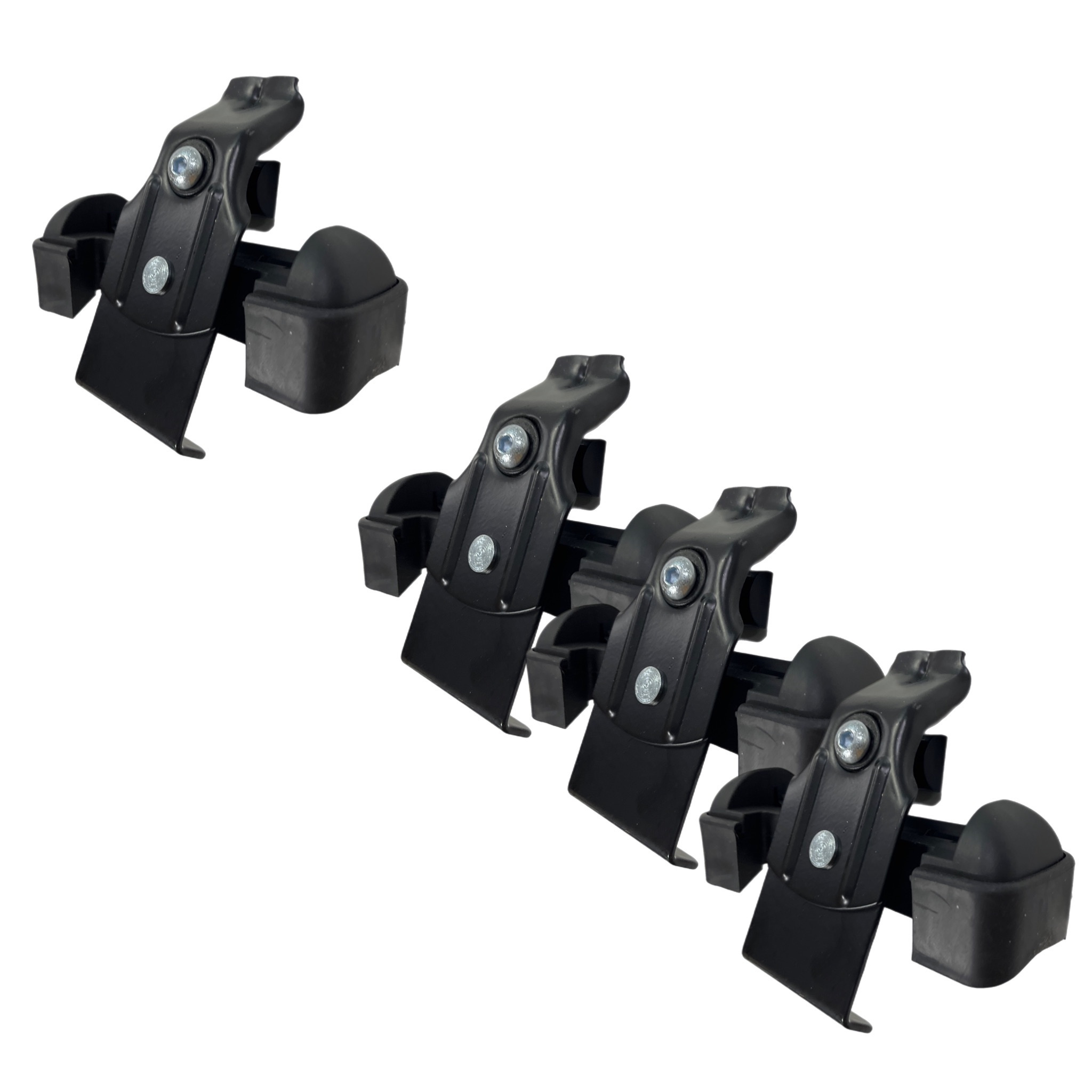 Комплект включает в себя набор резиновых подушек, крепежных скоб, болтов и других крепежных элементов, необходимых для установки багажника на автомобиль.Фиксация происходит скобой за дверной проем автомобиля.