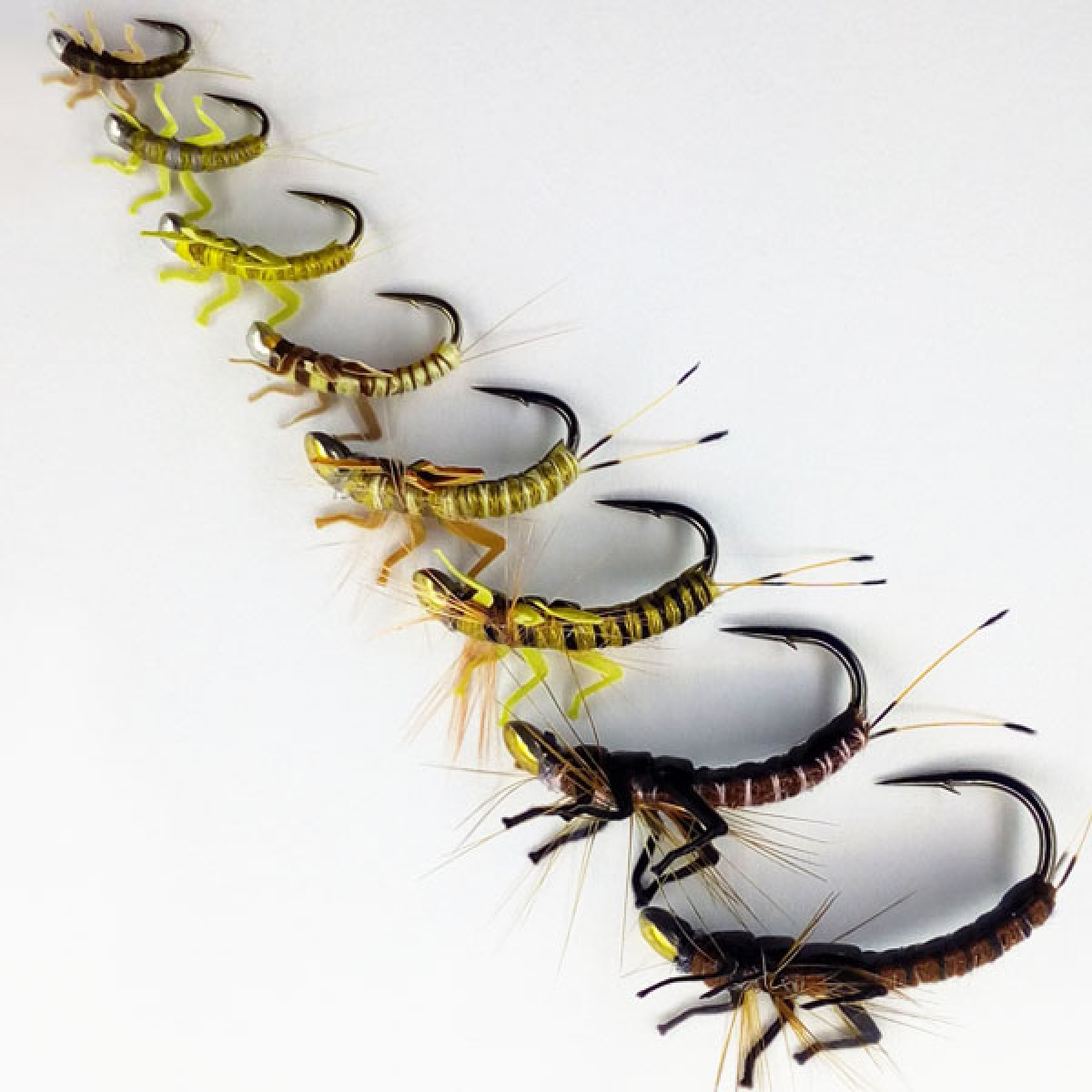Некоторые некрупные личинки веснянок при движении в воде выгибают тело в сторону спинки, двигаясь животом вниз. Идея подобного движения заложена в концепцию Переколомины драйв. По сравнению с классической Переколоминой мушка упрощена — вместо внедрения под ПВХ-пленку рисунок наносится уложенными специальным образом витками монтажной нити. Это уменьшило себестоимость изделия, а значит, и его отпускную цену. На крючке, правда, экономить не стали — Kamasan B110 великолепен по остроте и прочности. Практика на водоемах показала, что, задуманная первоначально как имитация небольшой группы организмов, эта нимфа может имитировать широкий спектр насекомых: веснянок, поденок, кузнечиков и, возможно, даже некоторых жуков.Переколомина драйв много лет держит первенство по продажам среди всех мушек «Черной речки», что, несомненно, вызвано ее повышенной уловистостью и возможностью всесезонного применения.