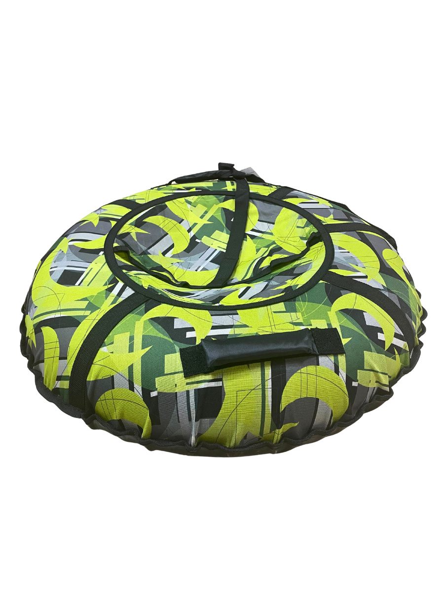 - Верх тюбинга выполнен из плотной ткани Оксфорд, покрытой ПВХ составом с внутренней стороны. На ткань нанесены весёлые рисунки, что повышает привлекательность данного вида продукции.