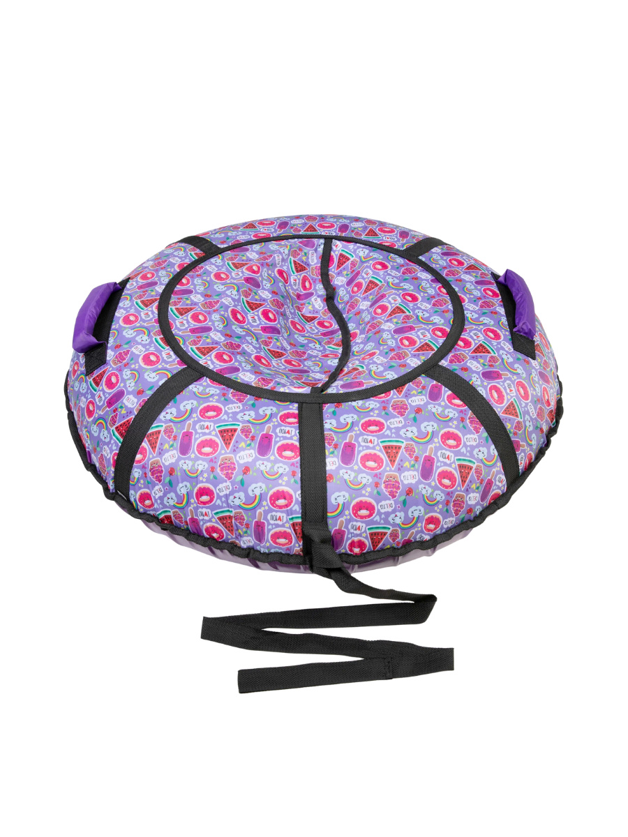 - Верх тюбинга выполнен из плотной ткани Оксфорд, покрытой ПВХ составом с внутренней стороны. На ткань нанесены весёлые рисунки, что повышает привлекательность данного вида продукции.